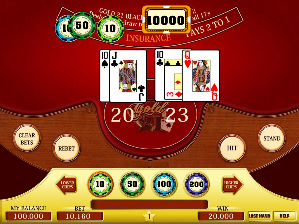Gold 21 Black Jack szabályai részletesen A Black Jack célja az, hogy a játékos lapjainak összege közelebb álljon 21-hez, mint az osztó lapjaié, anélkül, hogy 21-et túllépné. A Black Jackben az ász vagy 1-nek, vagy 11-nek számít (kivéve az osztót, akinél mindig 11-et ér), a figurák 10-nek, a számok pedig névértéküknek felelnek meg. Az osztó nem ellenőrzi a lapjait, ha elsőnek 10-es vagy ászt kapott, hogy Black Jackje van-e, a játék végig megy, azaz oszt magának még akkor is, ha a játékos (-ok) előzőleg besokaltak vagy, ha a játékosnak Black Jackje van és egyedül játszik. Ha a játékos az első osztáskor egy ászt és egy tízes értékű lapot kap, akkor Black Jackje van és fogadásának értékének másfélszeresét nyeri. Természetesen a tétet is visszakapja. (ha fogadása 10 credit pont volt, akkor összesen ennyit kap: 25 credit pont). Ha lapjai összértéke közelebb áll a 21-hez, mint az osztóéi, akkor annyit nyer, mennyiben fogadott és még egyszer a fogadás összege. Ha a fogadása 10 volt, akkor összesen 20-at. Ha játékos lapjainak összege meghaladja a 21-et, akkor az sok (több mint 21), a játékos elveszti fogadását. Ha a játékosnál és az osztónál ugyanakkora a lapok értékének összege (17 vagy több), akkor nincs nyertes ebben a partiban és a játékos visszakapja a fogadását (tétet). A Black Jack (10-es értékű lap + ász) megüti a több lapból összerakott 21 pontot. SPLIT (Kettéosztás): Ha az első két lap pontértéke megegyezik, akkor két külön kézre lehet azokat osztani, ha a játékosnak elegendő fedezete van. Ez tulajdonkeppen egy második fogadás. Ezután mindkét kézhez további lapokat lehet kérni. Minden felosztott kézhez annyi lapot húzhat, amennyit csak akar. Ha a játékos felosztott kézben egy ászt és egy tízes értékű lapot kap, akkor az 21-nek, nem pedig Black Jacknek számít. Az osztó kézbe kapott Black Jackje ennél erősebb. A már egyszer felosztott lapot (SPILT) már nem lehet tovább osztani. DOUBLE (Duplázás): Miután a játékos megkapta a két lapját, és úgy értékeli a kapott lapokat, hogy komoly esélye van nyerni az osztóval szemben, akkor megduplázhatja fogadását. Ekkor a fogadási összeg az eredeti kétszerese lesz (a különbség levonódik az egyenlegéről). A játékos ebben az esetben már csak egy következő lapot kaphat. Ha nincs elég fedezet a"My Balance" mezőben, nem lehet duplázni. A játékos SPLIT után nem duplázhat. INSURANCE (Biztosítás) Ha az osztó nyitott lapja ász, akkor a játékos biztosítást vásárolhat (fogadhat rá), hogy az osztónak Black Jackje lesz. Elég nagy - majdnem 1:3 az esély, hogy az osztó a nyitott ász lapjára 10-es értékű lapot húzzon. A Gold 21 Black Jack a játékosnak kedvez akkor, amikor lehetőséget biztosít fogadni erre a magas esélyre, azaz arra, hogy osztónak Black Jack nyereménye lesz-e. Ezt a játék elemet biztosításnak (angol nevén INSURANCE) hívják. Ha a játékos biztosítást vásárol, akkor egy külön fogadás kötődik. Ennek értéke az alaptét értékéneknek a fele, ez kerül befizetésrebiztosítási díjnak. Ha az osztónak Black Jackje lesz, akkor a biztosítási fogadása alapján 2:1 arányban biztosítási nyereményt nyer a játékos. A biztosítás fzet. (2:1 = hagyományos jelölés, amellyel azt jelölik, hogy a megtett 1 tét mellé kap a játékos még egyet) Példa: Alap tét: 100, biztosítási tét: 50 tehát az összes feltett tét: 150. Az osztónak Black Jack kombinációja van, a játékosnak pedig pld. csak 20 értékű lapjainak összege, akkor a nyeremény 100, azaz a biztosítási tét (50) 2 szerese. Valamint a játékos visszakapja a Biztosítási tétjét is. Így összesen 150-et kap vissza. Ha az osztónak nincs Black Jackje, akkor a játékos elveszti a bizosítási összeget. A játék végelszámolásakor persze az alap tét szerint nyerhet is a játékos vagy akár veszthet is. A biztosítás csak osztó Black Jack ellen van - és tulajdonképpen egy extra fogadás az alap fogadáson felül. Egyenlőség esetén - az osztónak is és a játékosnak is Black Jackje van, akkor a játékos megkapja a biztosítási nyereményt és az alap tétjét pedig visszakapja. Példa: Alaptét: 100, biztosítás 50. Tét összesen = 150. Az osztónak Black Jackje van és a játékosnak egy kisebb lap. A játékos elveszti az alaptétet, azaz 100-at, de kap 150-et a biztosítás miatt (3*50). Összességében a játékos a pénzénél marad. Extra Black Jack Egy már megnyert 2,5-es szorzójú nyereményt tovább lehet növelni, további kockázat vállalásával. Tehát ez egy, a játékos által választható lehetőség, bizonyos körülmények fennállása esetén. Az egyik feltétel, aminek teljesülnie kell, hogy a játékosnak legyen egy Black Jackje. Az osztónak pedig a nyitott lapja 10-es értékű lap kell, hogy legyen. Ebben az esetben a Gold 21 Black Jack játék lehetőséget ad a játékos számára, hogy a Black Jackjét tovább játssza, arra spekulálva, hogy az osztónak nem jön második lapként Ász és így nem lesz Black Jackje. Ebben az esetben a tovább játszott Black Jack (EXTRA BLACK JACK) értéke sima 21-nek számít a továbbiakban. Ha teljesül a játékos várakozása, azaz nem lesz az osztónak Black Jackje, akkor a játékos a tétjének a 3x-át kapja nyereményként, mivel egy biztos nyereményt és annak értékét kockáztatta és nyert. Amennyiben az osztónak Black Jackje lesz, a játékos veszít, ha sima 21 (több mint két lapból elért 21 értékű lap), 20 vagy annál kevesebb értékű lapja lesz, vagy "besokal" (BUST), akkor a játékos nyer. Kedvelt játékelem, mert elég nagy esélyt nyújt a játékosnak a nyerésre. 10 lapos Charlie Elméletileg lehetséges, hogy a játékos 10 lapot húzzon anélkül, hogy a lapok összértéke meghaladná a 20-at. Ebben az esetben a játé